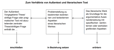 „Ziel einer Erörterung literarischer Texte ist im Kern die argumentative Auseinandersetzung mit dem literarischen Text und den in ihm enthaltenen Herausforderungen und Fremdheitserfahrungen (vgl. Abschnitt 2.4.1 der Bildungsstandards: „Sich mit literarischen Texten auseinandersetzen“). Gegenstand sind literarische Texte, an denen zum Beispiel Fragen der literaturgeschichtlichen Einordnung von Texten, deren Rezeption und Wertung oder Aspekte und Probleme des literarischen Lebens erörtert werden können. Es gehört zu den Bestandteilen einer literarischen Erörterung, dass die jeweiligen Befunde auf der Grundlage der im Unterricht erworbenen Kenntnisse in Beziehung zu Wertvorstellungen, Welt- und Selbstkonzepten gesetzt werden. Der dabei entstehende Text besteht schwerpunktmäßig aus einer Argumentation. In diese müssen Befunde der Analyse und Interpretation des Ausgangstextes im Rahmen der Aufgabenstellung einbezogen werden. Literarische Erörterungen enthalten auch erklärende und informierende Anteile (vgl. Abschnitt 2.2.2: „In unterschiedlichen Textformen schreiben“). Ergänzende Grundlage der Erörterung kann auch ein audiovisueller Text sein, zum Beispiel ein Ausschnitt aus einer Theaterinszenierung.“